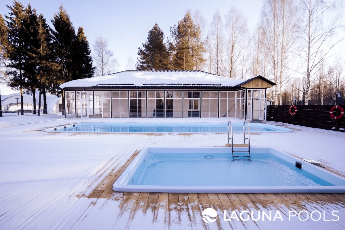 Композитные бассейны с голубой водой зимой, деревянный настил и панорамное здание