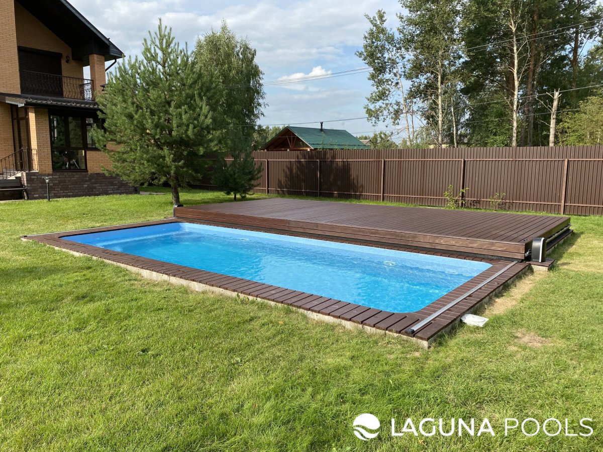 Композитный бассейн с голубой водой частично накрыт сдвижной террасной доской на зеленом газоне.