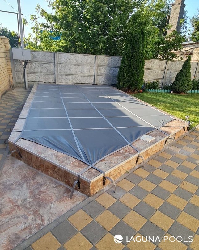 Прямоугольный бассейн с серым защитным тентом и облицовкой из плитки на фоне газона и хвойных растений.